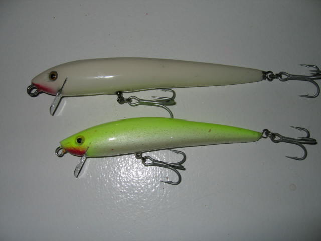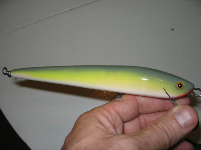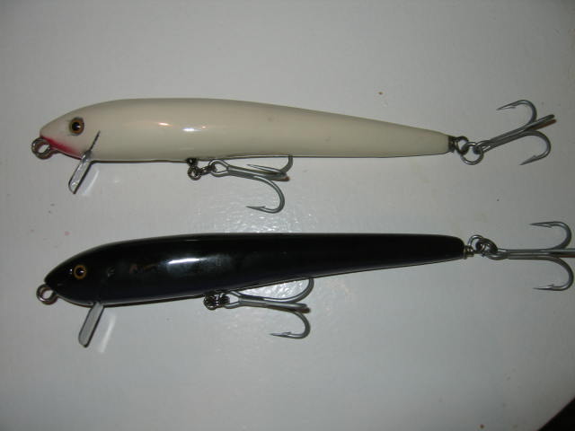 I havent got a lathe for fear of instant divorce  but having lurked for a while so i handcarved some basswood recently and based them on Gary 2 tigers ...these are like bomber long A ...2 oz 7 inch , leave a wide tail wake >>>> on a slow retteive and dive 1-2 ft with a tight ~~~~~~~~~and back up quick . only took a day each  through wired, sealed with epoxy like Gary 2's. Had to cut and file the lips ....anyone know where to get bomber lips ?