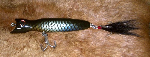 I realy like POPPERS I only have 1. it's a GIBBS. I have a few plugs I built this past winter, an I decided to CONVERT 1. here it is the BIG GREEN WOOD. I took it an SANDED it down, I picked up a small 3/4" drum sanding attachment for drills an put a CUP in the mouth. seem ok so far, also re-located some weight. fill in all the holes an sealed it.