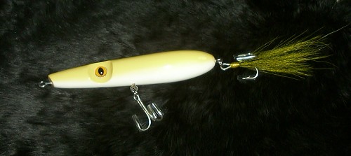 I guess it's BIG. for me anyways 1 1/4 round 7" long havent weight it yet. I picked up a DRUM attachment for my drill. to give the EYE SECTION a different look ( say it done on here ) then drilled the eye in. it is YELLOW/WHITE, Cat eye. did BLACK/YELLOW deerhair tail.