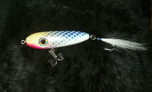 Like it says just playing around, hand carved, rattle can painted. havent weight it yet .don't know if it will catch? BUT Ill take it swimming