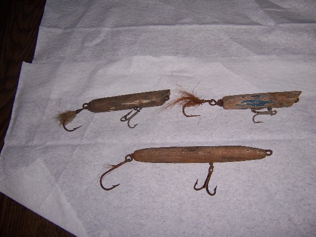 Next are a trio swimmers, made some time in the 90's,fitted with homemade lips, two out of the three have been refinished, the originals all sported bead eyes and were painted with good old rustolium and varnish, they all caught fish, none were fished again after refinishing....