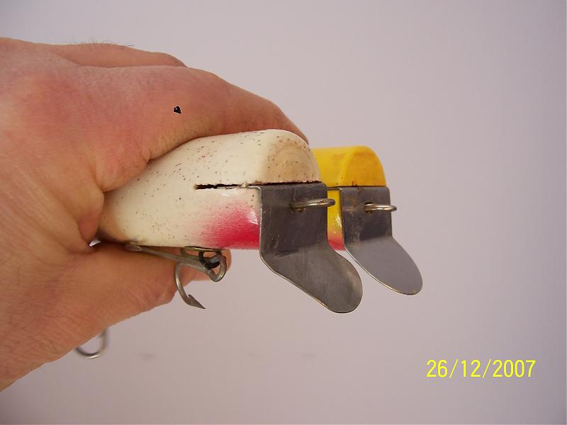 Yes lip slot is cut above the center on both. By my calculations, and these are only from plugs I have measured, the lip slot is .050 above center on the P. and .100 above center on the BM. The front face of the lip is .600 long. It ends up even with the bottom of the P. and slightly above the the bottom of the plug on the BM. Now you also have to take into account they put the slot in the same exact place on each of the 1000's of plugs they made or make. Taking that into account, variation, I would think they shoot for the bend to be pretty much even with the bottom of the plug IMO. I also seem to remember the lip being even higher, extreme, above center on the full size Conrads. But look at these pictures below and they only look slightly above center like the Jr.'s We shall see when I get it in my hands. I really think the lip orientation is fairly variable + or - .030 on the location, which probably gives pretty consistent swimming action either side of the 1/32 location. Not to say if you could put them exact every time that you would be better off. P.