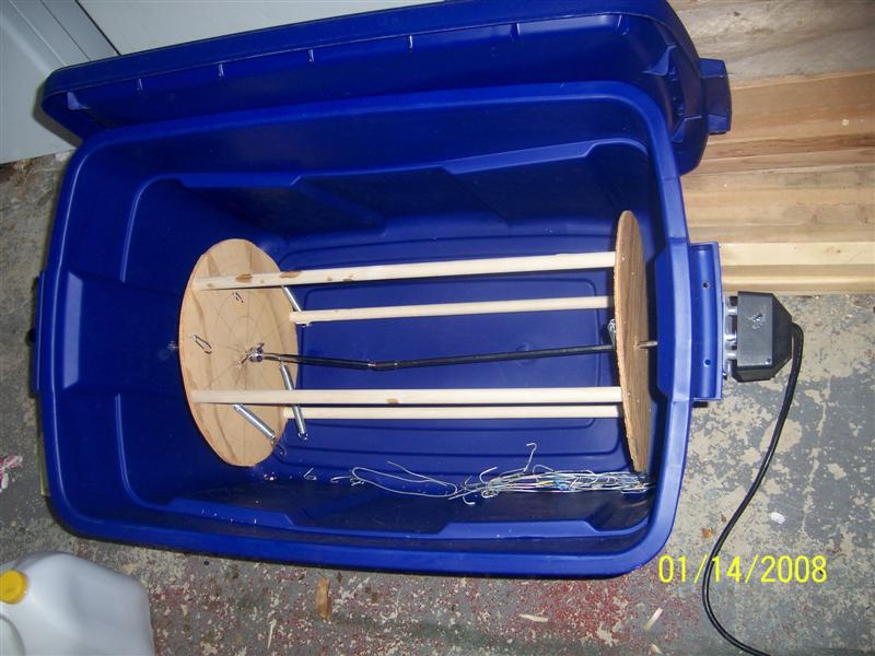 Here's a pic of my spinner, I just built it Saturday, and ran one batch of plugs through it. I am generally a cheap bastard, and I've been looking since last winter for a gearmotor to run the thing, but finally, I had plugs painted and it was time to etex them and so I went to Homies and bought a Charmglow grille rotisserie kit, and used the motor, brackets, and skewer pieces, and bought some springs and screweyes to finish it. It turns nice and slow, and is very quiet.