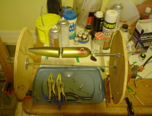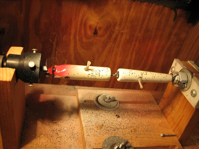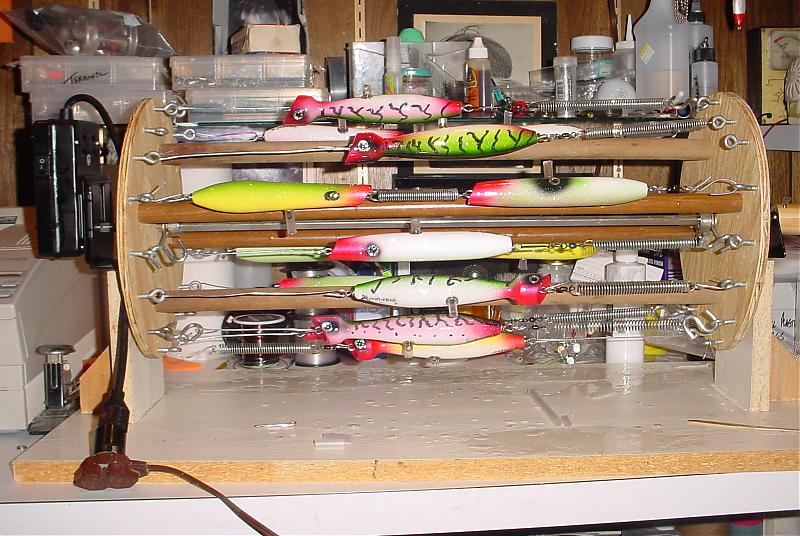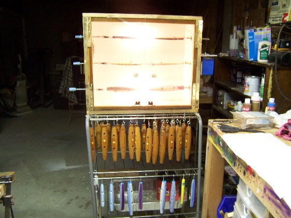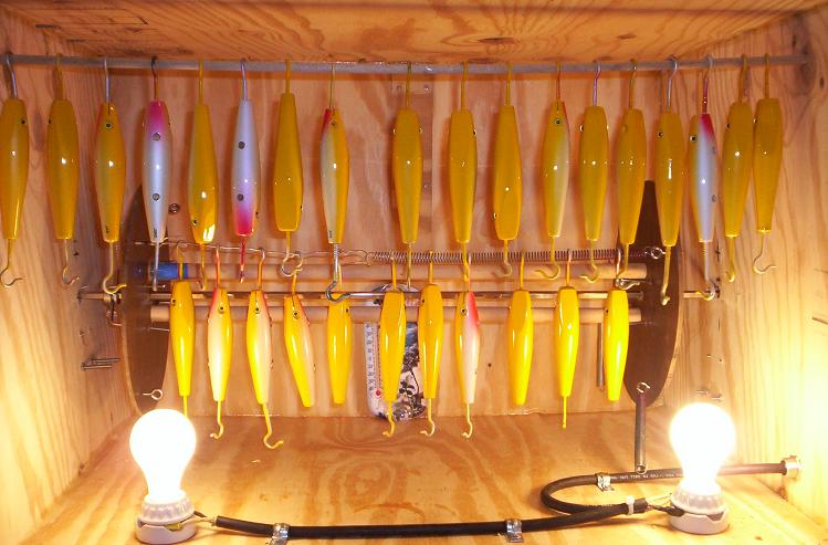 I've been that route, Now with the threaded rod I no longer have to deal with springs that stretch,sag and unwind or are not the proper length to keep the epoxy uniformly on the plug.... I have 6" of adjustment, can spin even odd shaped plugs like hand carved bunker /rattle traps and darters with narry a problem, the etex is pre heated in the box, it then pours like milk... mix thouroughly until it is gassing freely, the whole time I'm mixing ,the plugs have been in the spinner warming up, I can apply a paper thin coat of e-tex( most problems from e-tex use stem from to thick of a coating on the plug) with a 3/8"acid brush as the plugs spin, with lights at the top and bottom there are no shadows thus virtualy eliminating dry spots, once I've epoxied all six plugs, I go back and wipe any excess epoxy off of the tail and lips/heads with an acid brush and check for dry spots, I never even exhale or torch the plugs, I close the doors and set the timer for 3 hours and go work on something else, or got to bed...Handeling of the plugs is at a minimum so chances for contamination are nil....