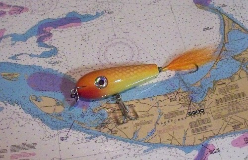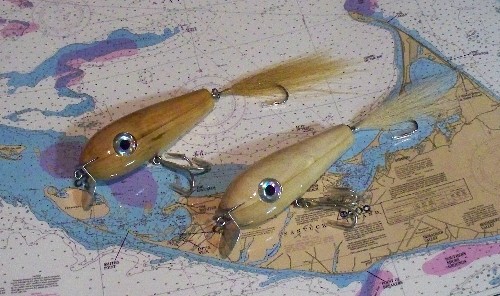 A couple more NUDE you can see where they glued the wood together, Iused that as the lateral line on the plug, Ill have them at plug fest if you wish to see them up-close an personalthey all have 5/0 hooks on them, even the tail hook is 5/0