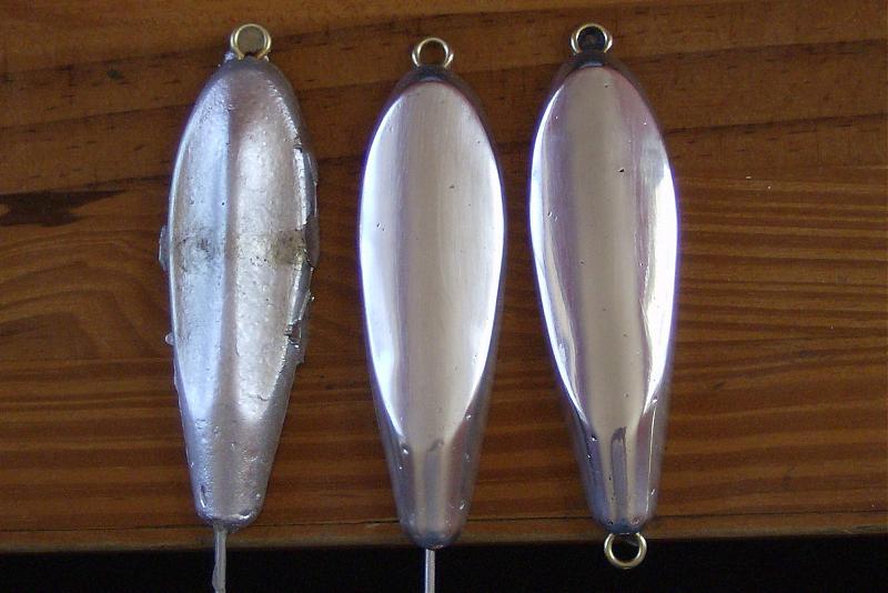 Here's a before and after. I made the molds for these by turning some off center stuf on the lathe and then making a bondo mold from that. They're rough but at this stage I'm still trying to gt them to do what I want and to get the weights right. They come out pretty rough from the mold, it takes me 20 min or so to get them from the way they come out (on the left, to the way the middle one looks. Thats using sandpaper & steel wool. Then I hit it with the buffer and it puts a pretty good shine on it, like the one on the right. Now I just need to make them 1/2 an ounce lighter.. Once I get them the way I want, I'll try & find that wenol stuff to keep em shiny.
