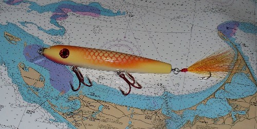 This one is 8" weigh's in at 3.2 oz,Red Hooks are 4/0 I picked up at M&D's Saturday.now I need to find some RED 5/0 hooks.