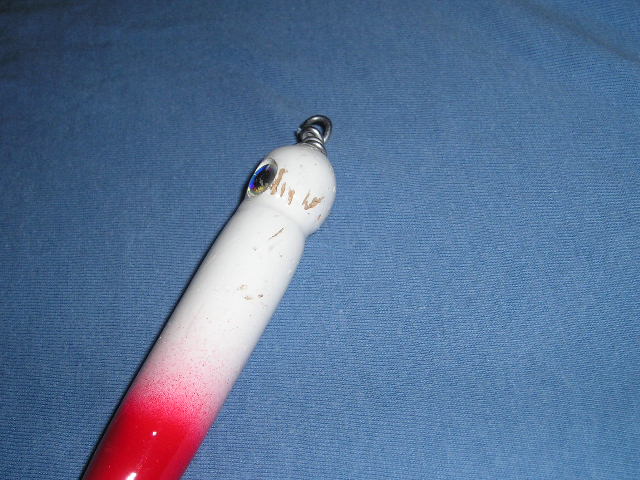 Well, I had a good late spring down on the cape. Got a bunch of trips in and got to throw some of my plugs at the blues. Here are a couple pics of one of the plugs with some teeth marks. Caught a whole bunch on that one! Still got a lot of life left in it. But thinking of hanging it on the wall. I Have a section of my collection dedicated to chewed up plugs. Paint and epoxy held up pretty well. That particular one has flex coat lite on it and createx paint. I was happy with this plug design. There is 1 oz of lead in it and it flies like a rocket, it skips accross the surface nicely.