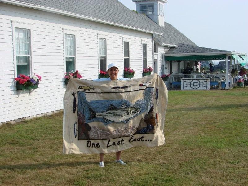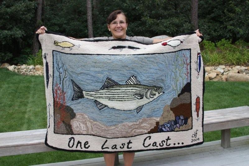 Anyway, she has been making pillows and small rugs for a while now but she just started a much larger rug and it has a striper theme. She showed me the work in progress (below). She said it will take a few more months before she is complete. I will post a final photo when it is done.