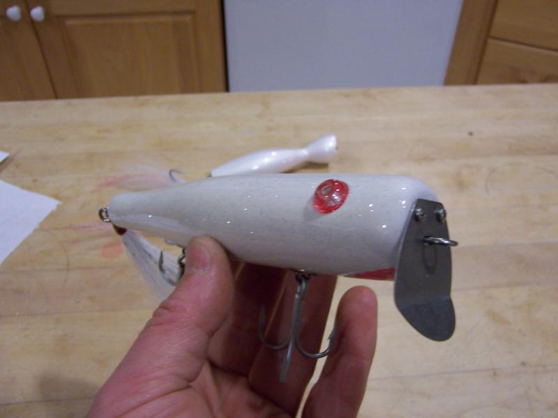 paul, i was fishing the other day off the beach in soco ri and a old timer was fishing a real goo goo...this guy had to be all of 70 and he never took the goo goo off fished it for 2 hours, mid day...bunker on the beach...I was watching him...I've really never seen anyone fish a goo goo before. he had the lip bent down like yours and was hitting spots between rocks and eddyies around them...fishing it topwater to a little sub surface..he never stoped plugging and after like 2 hrs he hooked up with a 36 inch blue...you could hear his 704 from 20 yards away crying.....what a fight...it was great watching someone with years of experience fishing a goo goo...his plug was white like yours  your plugs look great  he was useing the 8 inch one and getting some good distance too