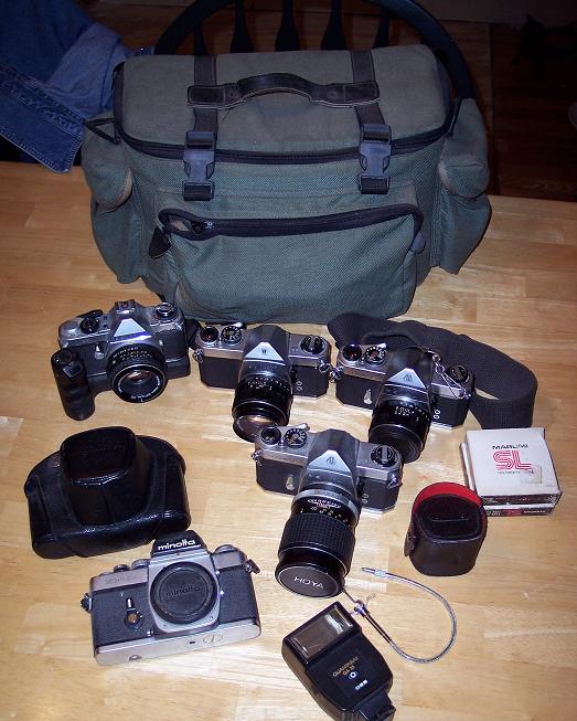 This is a camera I had used for many years and will miss terribly.....but the digital age has been here for awhile and I have not used them for quite some time! Included are 2 Pentax (Asahi) Spotmatic cameras w/50 mm lens on both. Pentax "Honeywell" model of same Spotmatic camera. (Spotmatics are screw mount) A Pentax ME Super (K mount) with autowind (not sure if autowind works anymore.) Also a Minolta XE 5 body (K mount). Cameras are in great shape....one spotmatic has 2 chips in the viewfinder glass but works just fine! Also included is a Hoya 135mm lens (screw mount), 2X extender, flash, and some other assorted extras. The bag cost me $80.00 25 years ago and is heavy duty canvas...dusty and faded but still in great shape and is padded. This is a great buy for a beginner in photography, a student in photography or anyone who just likes the old cameras. $100.00 for the lot.....you pick up! Will ship for an additional $20.00 but no guarantees on anything as they are old and I have not used them in about 4 years......they do work though, just not sure on the autowind. Feel free to ask questions for details on the lenses.