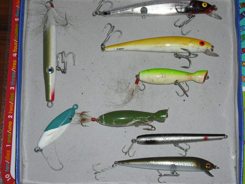 2 bombers, 2 tiny gibbs polaris poppers. 1 salty stubby needle. 1 roberts ranger. 1 mambo minnow. 1 tiny gibbs pencil. trade for t-shirt, hat, fish stickers