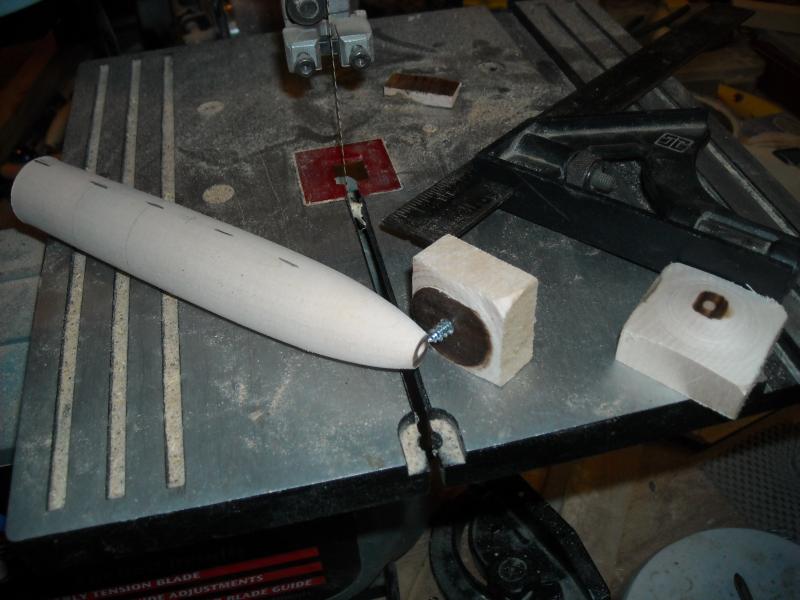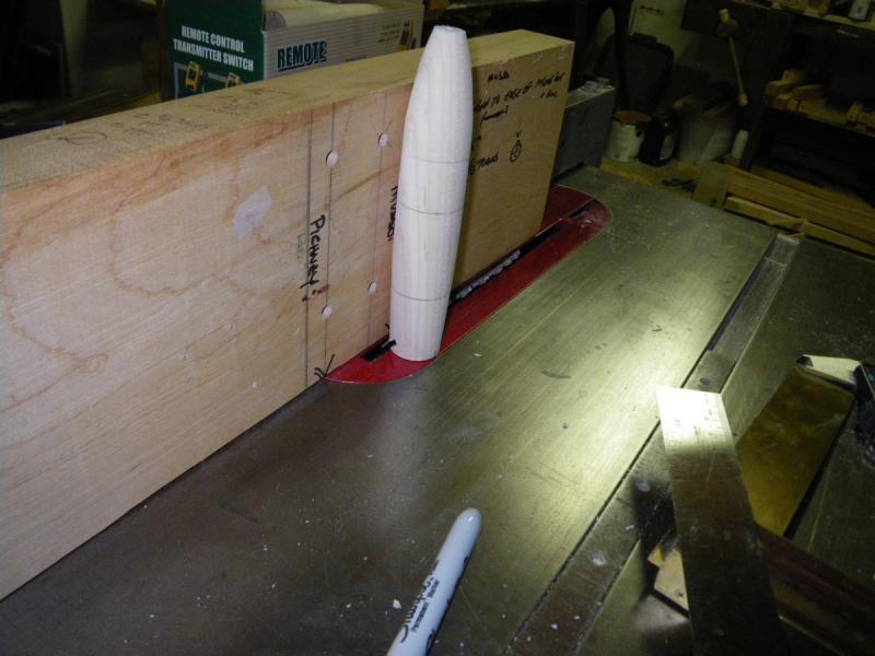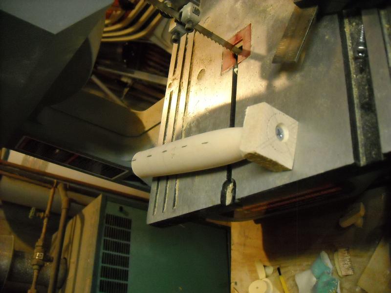 I am working on my first darter. I wanted to hydro orient it, as it will be unweighted and I wanted to do what I could to get them to sit right. So after I cut off the square ends of the stock and floated it to find what side was up, I was trying to think of a way to work with the round blank as I've had more than my share of shop 'incidents' and I want to use the table saw to cut the lip slot.