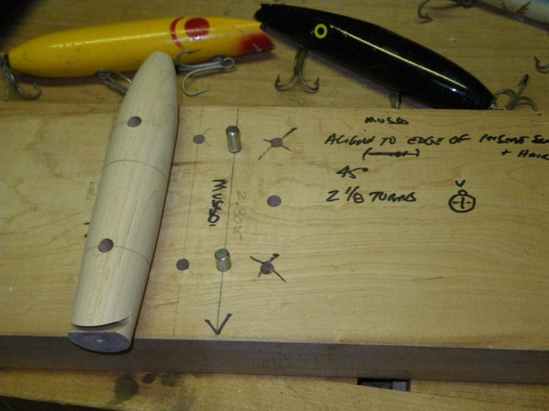 Another way I've seen people do it. You can drill a small pilot hole where the belly hook will go then use a L shaped piece of wood (with squared sides) with a hole in each limb of the L. Screw the plug on through the long limb, then center the tail by screwing into the wire hole through the short limb. Use a piece of aluminum angle stock and cut your slope and lip shape into it. Use it to mark the plug blank while in the jig and take it to the band saw and cut it all. Clean up on the sander, and enlarge the screw hole in the belly to grommet size. Credit to Eddy for this one.