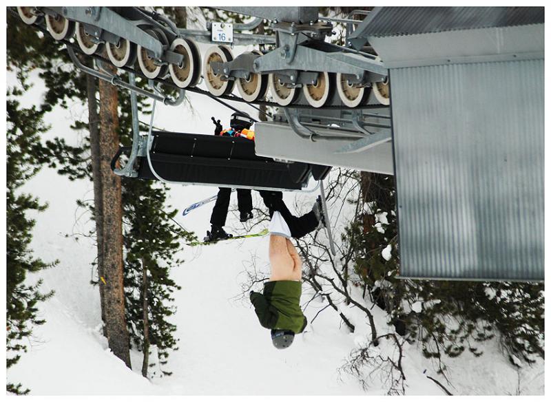 JANUARY 6--In a bizarre incident that will surely lead to litigation (or an out-of-court settlement), a skier at Colorado's ritzy Vail resort was left dangling upside down and pantsless from a chairlift last Thursday morning. The January 1 mishap apparently occurred after the male skier, 48, and a child boarded a high-speed lift in Vail's Blue Sky Basin. It appears that the chairlift's fold-down seat was somehow not in the lowered position, which caused the man to partially fall through the resulting gap. His right ski got jammed in the ascending chairlift, and that kept him upended since his boot never dislodged from its binding. As seen in the photos on the following pages (which were snapped by fellow skiers), the Skyline Express lift was stopped shortly after the pair's botched boarding resulted in the man dangling from the lift. The exposed skier was stuck for about 15 minutes before Vail personnel backed the lift up and successfully dislodged the unidentified man from the four-seat chair. The images on page four and five were taken by Marty Odom (who can be reached at