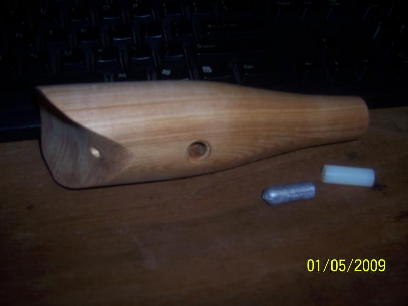 here's an example (not a spook but same ideafor the weights) this one is drilled almost to the belly hole about 3" deep. These are not the inserts I'm using for this plug-just what's handy at the moment. The nose hole is way down almost in the botton of the cup, so the weight acts as a keel along with the bouyancy of the wood above the through wire, keeping this plug upright. I'm really looking forward to this one hitting the water for further testing.