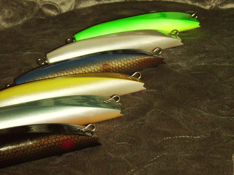 Here are the 3oz Darters. These run about 5 feet deep and their darting motion is not wild, it's more of a searching baitfish looking swim. The action is dead-on to the original Pichney Darter.