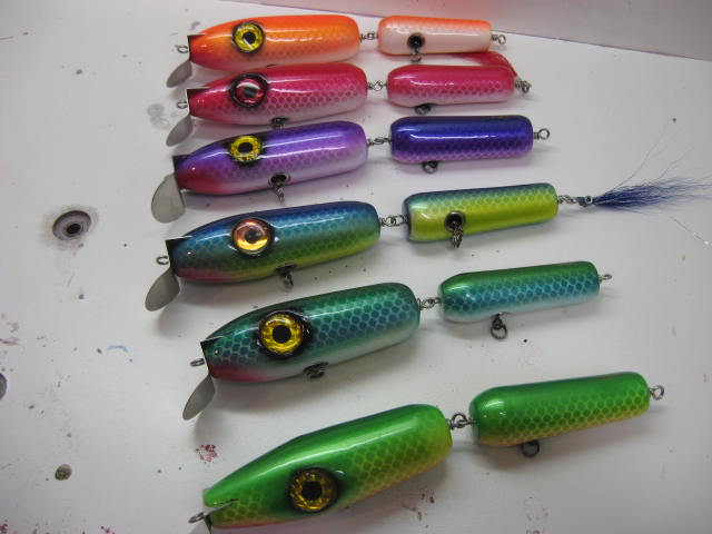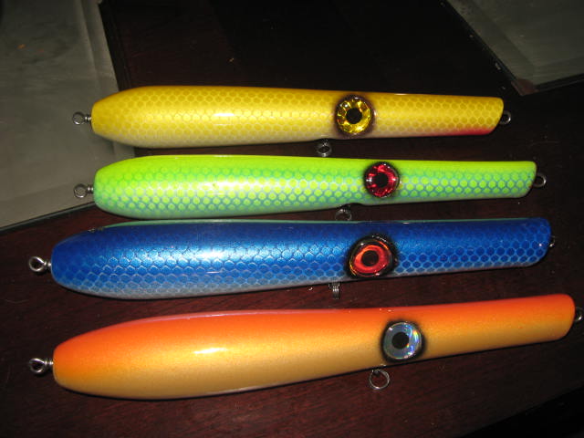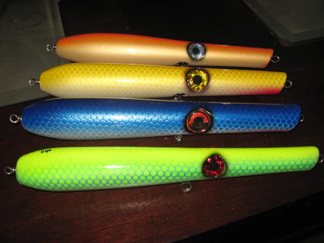 Im open to trades! show me whatcha got! Heres a few pencils from the same batch. 3.5 ounces and 9 inch. I think they could use a little more tail weight to sit a little deeper on the @ss end. Next pencils will have 1.5 ounce tail weights and a flat bottom.