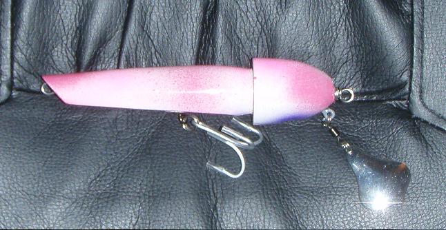 I've seen 2 variations of this plug , built by a well known local canal fisher . Not of internet fame but quietly fashioned jiggs , wood and rubber to catch fish in the ditch . The inspiration for building this plug was Big Daves fishing partner and friend, the late Paul Karnicki . Paul laughfingly called this a pecker plug . You can't see it but the head is back beveled to pull water . I've also seen real old freshy versions of a pecker plug .. Do you know who made it orig .