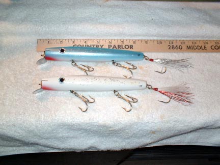Here are two googoo eyes. Supposedly Cinto took a 73lb bass trolling one on wire. The biggest is 8 1/4"x 1 3/8" , the smaller 6 1/8" x 1 1/4". Yes, those are screw eyes. The line tie is central. I think they are pine. If they are weighted it must be in the nose since I cant see a weight hole in the belly.