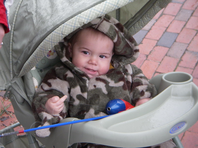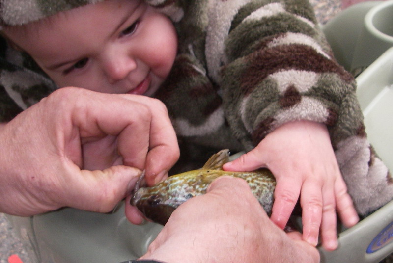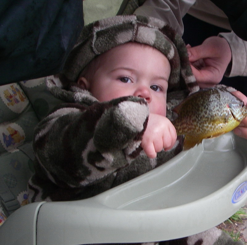 He was excited and knew how to jig the plug although he showed me that he dosen't like people moving in on his spots. Then we put worm on and at 10 months old he handled his first sunfish like a pro.
