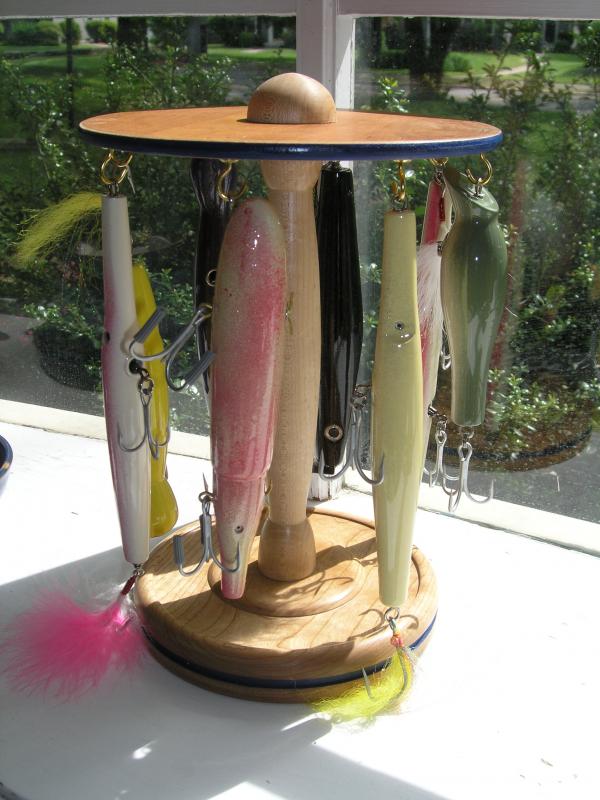In order to display my "Surf Candy" striper plugs Iwanted to have a quality presentation rack where the buyer can handle the product before I drop it in a plastic plug bag. So I am making several of these cherry and bird's eye maple display racks. Plus they can also be used to organize synthetic fibers for tying dressed tail hooks.