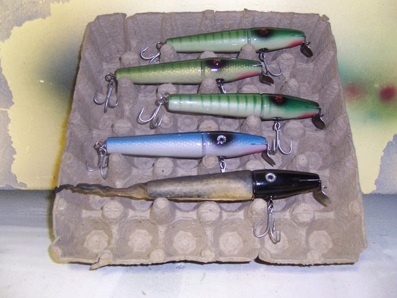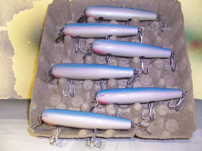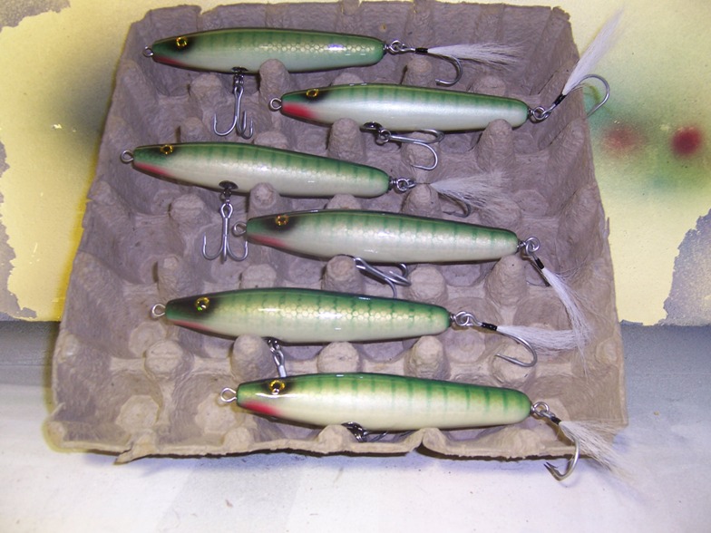 Next are some 6" 40 style swimmers, I tail weighted these and power them with a modified danny lip... I love the action ( so did the fish).. and they drill into the wind....I tried several different woods and weighting schemes and lips.. the above combo and WRC gave me the best action..