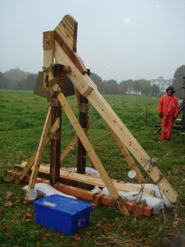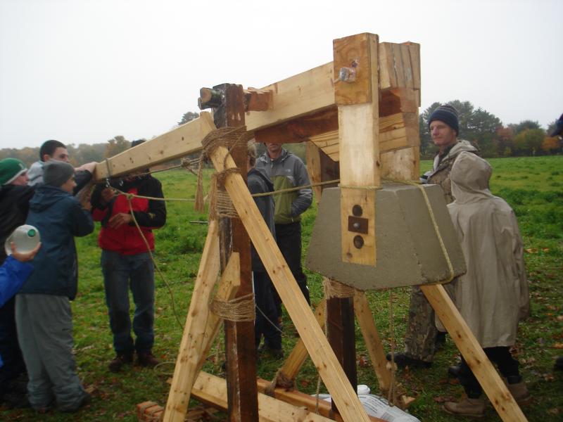 Here's a couple of pics of the trebuchet....the weight was solid cement and weighed in at about 300 lbs. the only metal in the whole unit was through the weight and the firing pin...other than that it was all wood, pegged and lashed together.