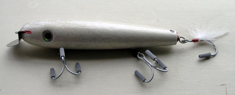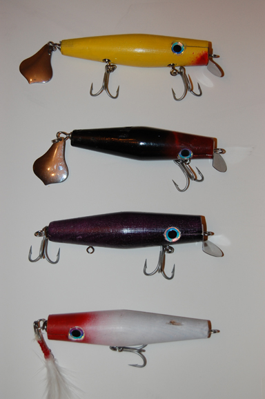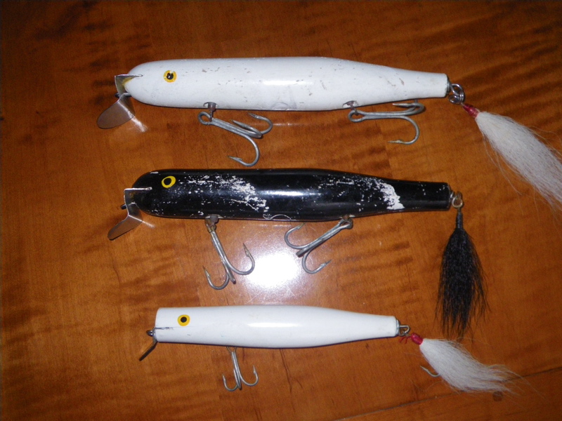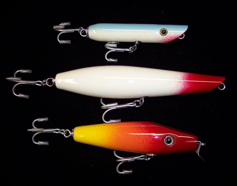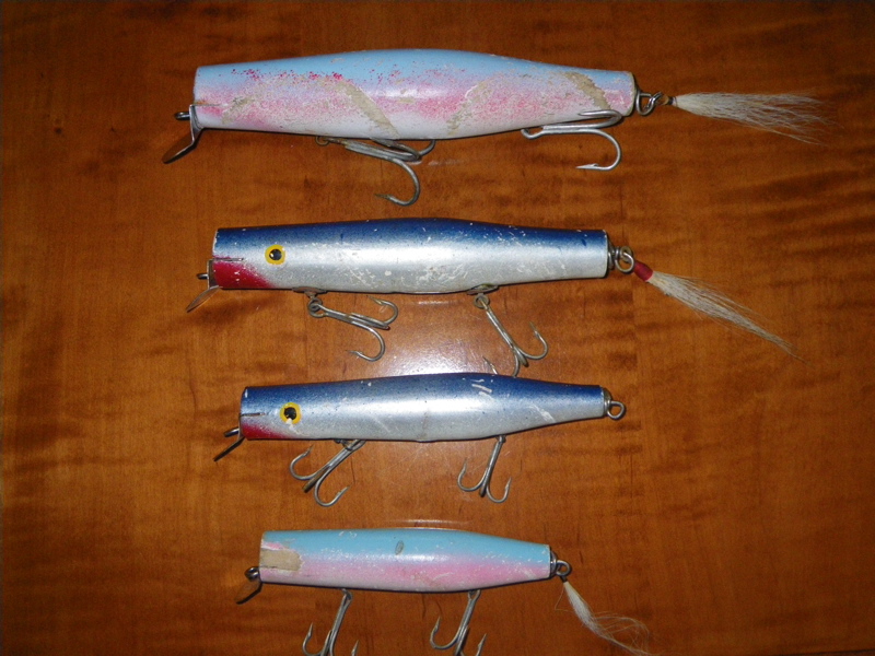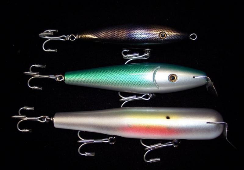 After a hiatus from fishing for a while (training, marriage, new job, first kid), I got back at it in the mid 80's.........at which time danny style surface swimmers where briefly unavailable so I started building my own. The whites and black were my very first and all caught fish. The top one was 8.5" and carries 5/0's.