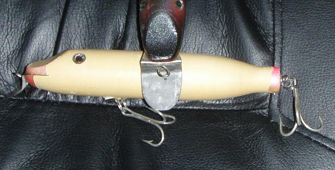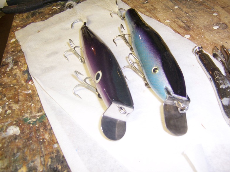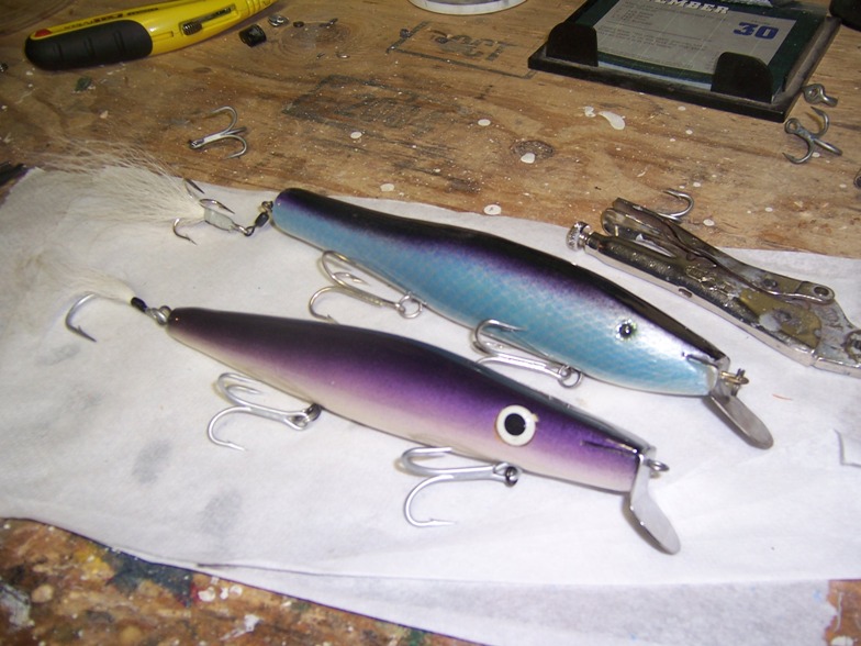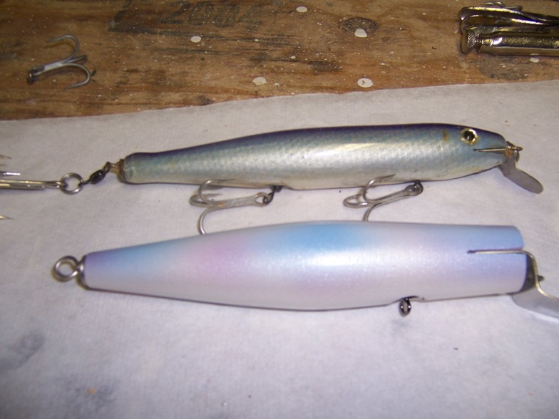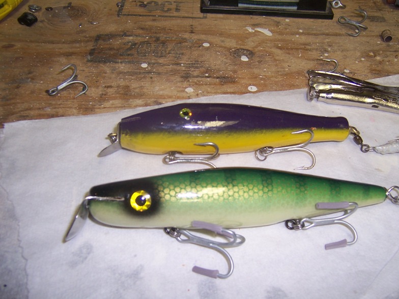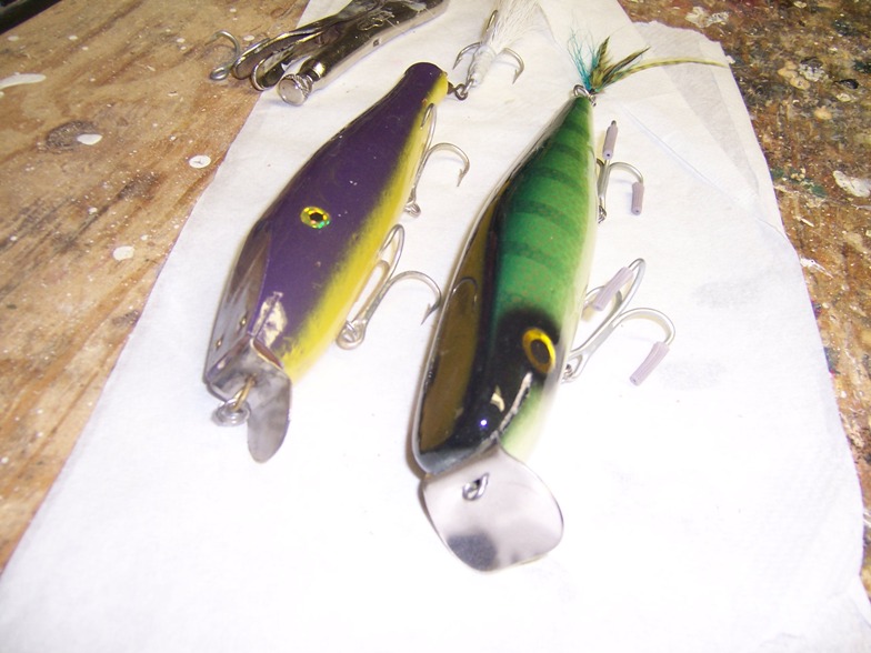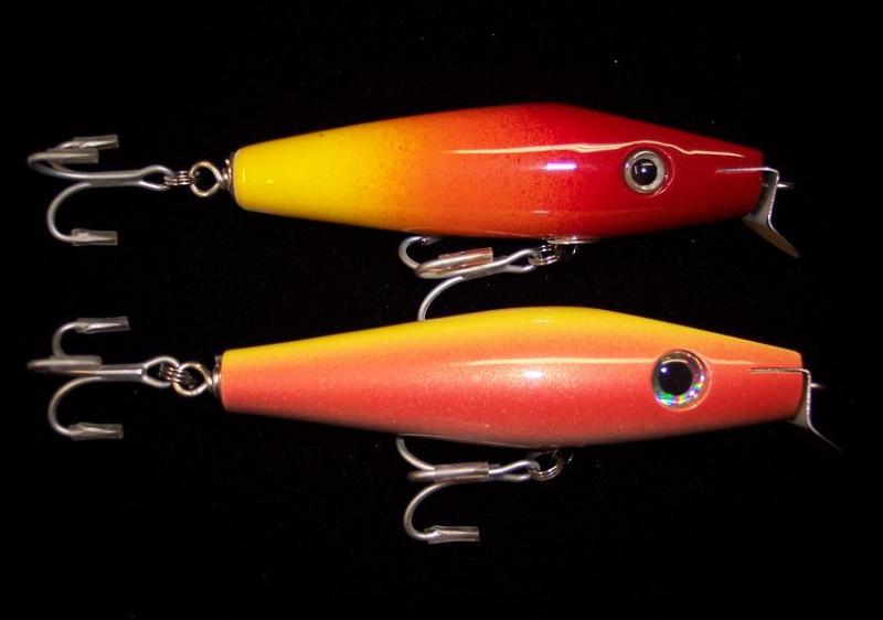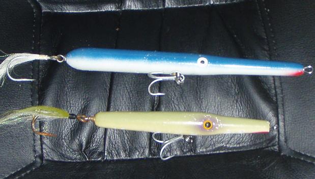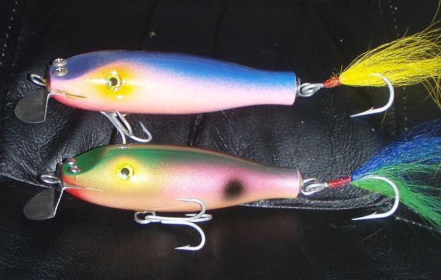 When I started building it was about the same time as Mac . Nobody would tell you nothing (like todays clear coat). NJ wasn't making lips and if you were building a surfster you were probably using a colorado blade for a lip . Sounds like an old timer but it really wasn't that long ago . Here's a couple of early ones .. I can tell because of the primitive home made lips . I gave one of these to Mac and he proceede to peel the whole plug like a banana and gave it back to me .. (prick).. I also remember giving Slip a yellow danny only to the belly holes way off as it passed hands .. imbarrising ..