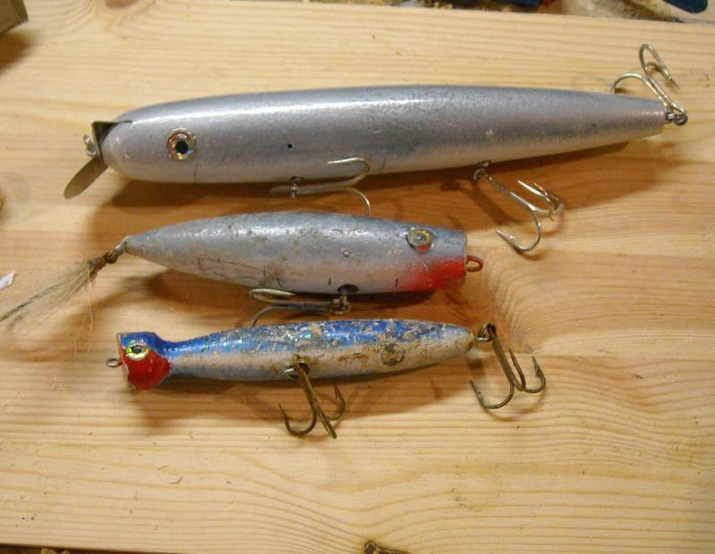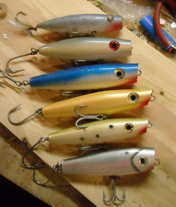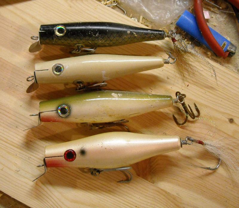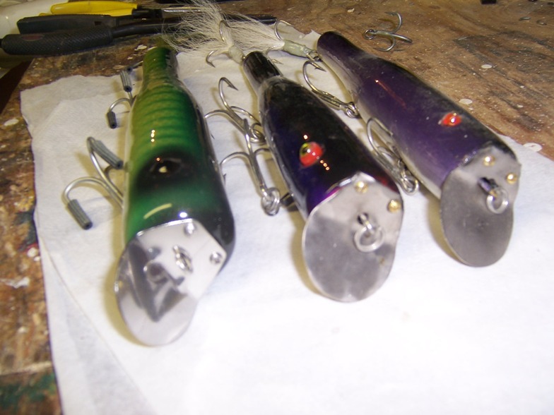 First picture is from the first year, all screw eyes with swivels 'pinned' with stainless nails... The two poppers took a lot of fish, the swimmer was too heavy to cast (over 5 oz). The popper in the middle is a shape I've played with a lot.