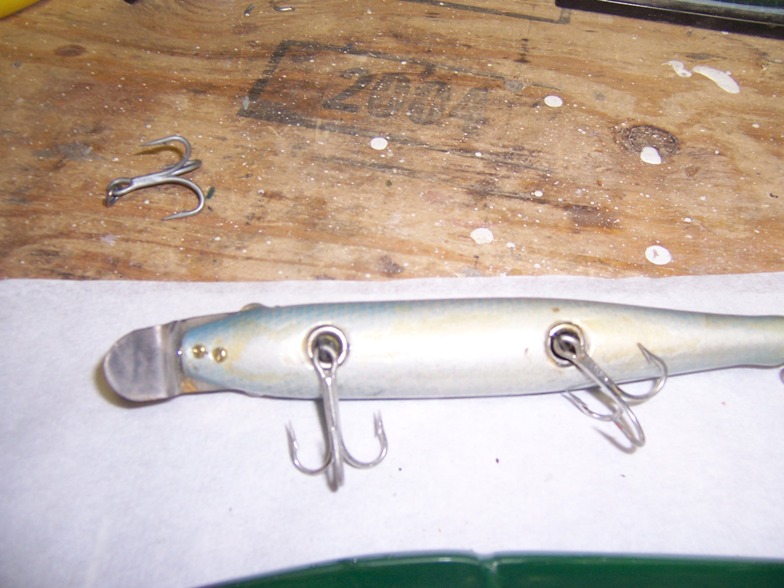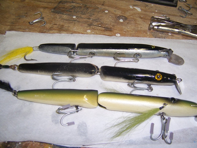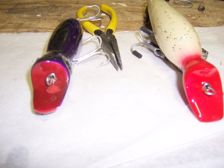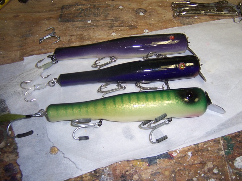 the top one was the first effort... brass wire and pinned tail hook... it didnt swim very well.. it never caught a fish either.. the middle plug was the next step.. it took hundreds of bass and was refinished twice.... it was the last plug i painted (on a regular basis) with rattle cans.. i retired it last spring. in favor of the fish catcher below it...