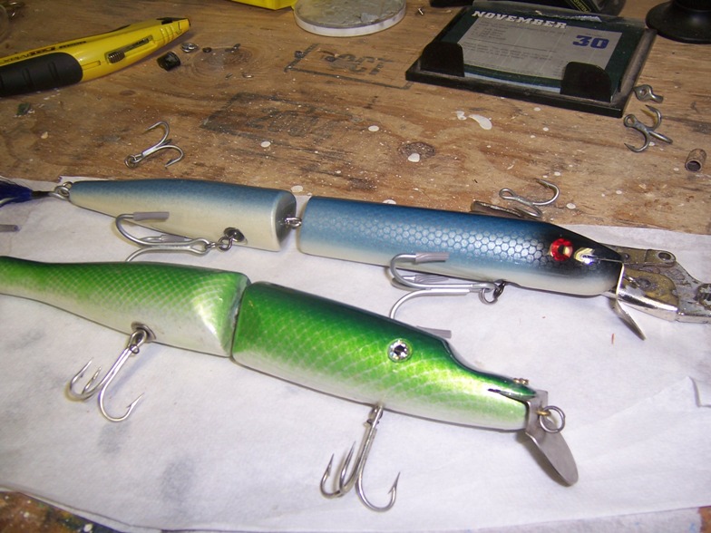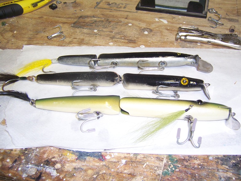 The multi-jointed swimbait has done pretty well on larger smallmouth this year. The jerkbait bait below that, foiled, also a good smallie bait. Those two are "handcarved". Rest are lathe turned plugs. Spook, pikie, bottle, and off-center plug. All have done well for stripers and bluefish.