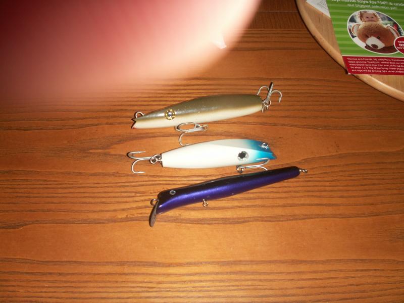 FS - Two tatoo darters, one 3 oz olive/white, one 2 oz blue head, one canalman handcarve with a peavey guitar pic as a lip...$100.