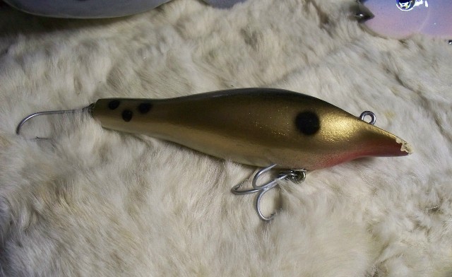 My first again theres so meny plugs to build after 6 years Im still doing FIRST, an have more on my list to do. anyways here it is 6.1/2 long, weight in the tail, havent weight it yet. Ive seen a lot of them an had a hard time doing the HEAD SECTION. like my DOTS just starting to get them down also, after looking at another plug I saw I put them upside down. I took it swimming the outher day, swam pretty good, I even smashed the lip section on bottom, shallow water. so now Ill top coat it, an beat the hell out of it next season. this will be my 1. an only to hard to carve all the angles