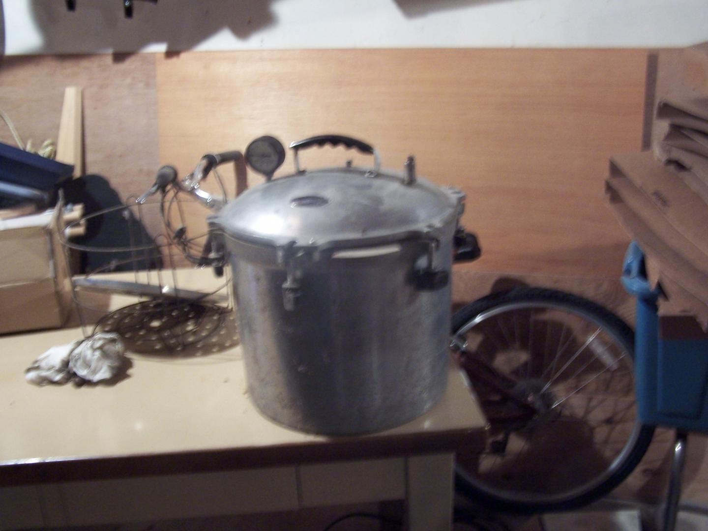 Also I have about a five gallon size pressure cooker that is about 30 years old. It is the kind with a pressure valve/guage on top with swing bolt that get pulled up over the side and tightened down.