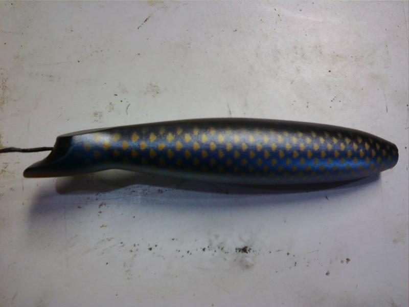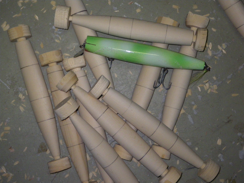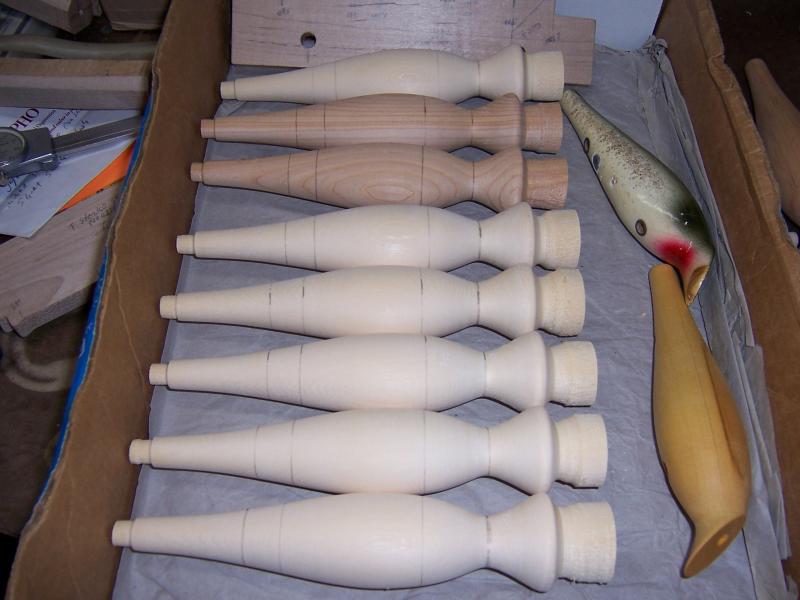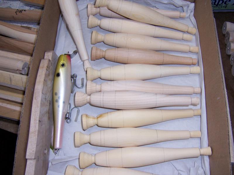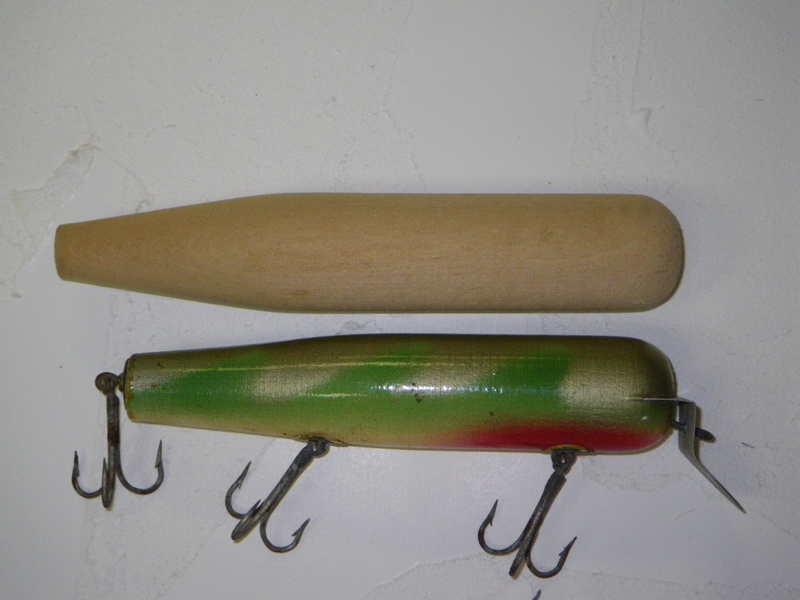 Good Morning Guys. I passed out after I woke. Had a little headache. Must of been the smell of wood chips and sealer!!!. Heres whats coming out of my Plug Dungeon. 5" Stubbys needles( My stapleford), A-40's copied from an old 50"s wallhanger & BM repros . Next round of spinning will be the Atom jr style from the early seventys, BM spin Atom and a odd Atom Jr. which was given to me by an old friend. It was broke at the rear hook hanger. I epoxied it together and fish with skin. This model is slightly thinner in body and shorter by1/4". This plug also had a tail weight. Is it an Atom 54B ??