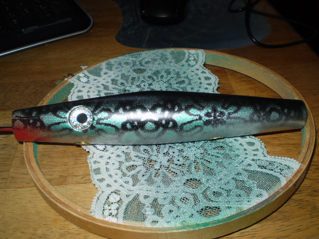 That's just what I did, kinda like Prince... That is an embroidery hoop, I used it to stretch the lace so I could just lay it down on the plug and spray the paint. I have another for netting to make scales. After I spray I wave a hair dryer over it to speed up the drying process. I can layer three colors both sidea in 10 minutes this way.