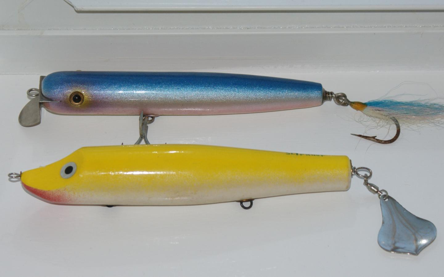 The top plug in the first 2 pics were made by me. The blue one is a round nose swimmer. And the Purple haze in the second pic is a Big Bernster body with a Surfster lip. Both are around 2 oz. and I made very few of either of them.