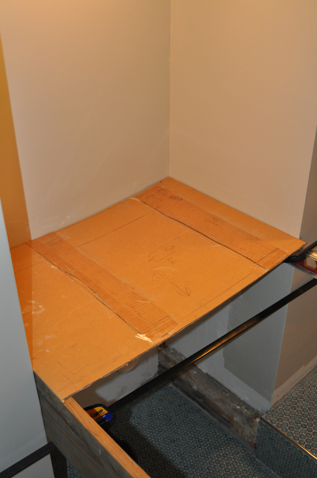 Here are some pics of the space. The template in the photo is 29-1/2" wide with perfectly parallel sides. The right side is 20-3/8" to the back wall and the left side is 19-7/8". Note the walls are not of equal length and the counter will be exposed on the left corner. Hence the reason I'm going to make the cabinet myself.