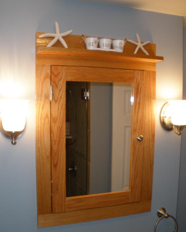Our bathroom renovation is now officially complete with the addition of a custom built in medicine cabinet! Oak with satin nickel hardware to match the rest of the bathrooms hardware......1/4" glass shelves! I am very pleased with the final results! Not bad for my first cabinet! There are a few things I would do different next time but it looks fabulous! Special thanks to Slipknot for his help rabbiting the door! Bruce.....I screwed that door up and had to build another one!