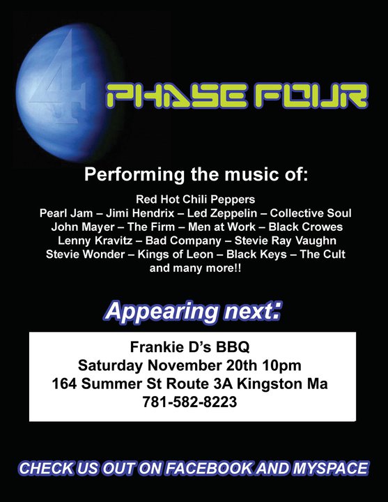 If any of guys and gals near Kingston want to check out a great free show and have some fabulous BBQ come check these guys out. The band has really taken off now and places are booking them up because they play such a variety of tunes that get people moving and grooving. Great local take and Frankie D's is an awesome little place.