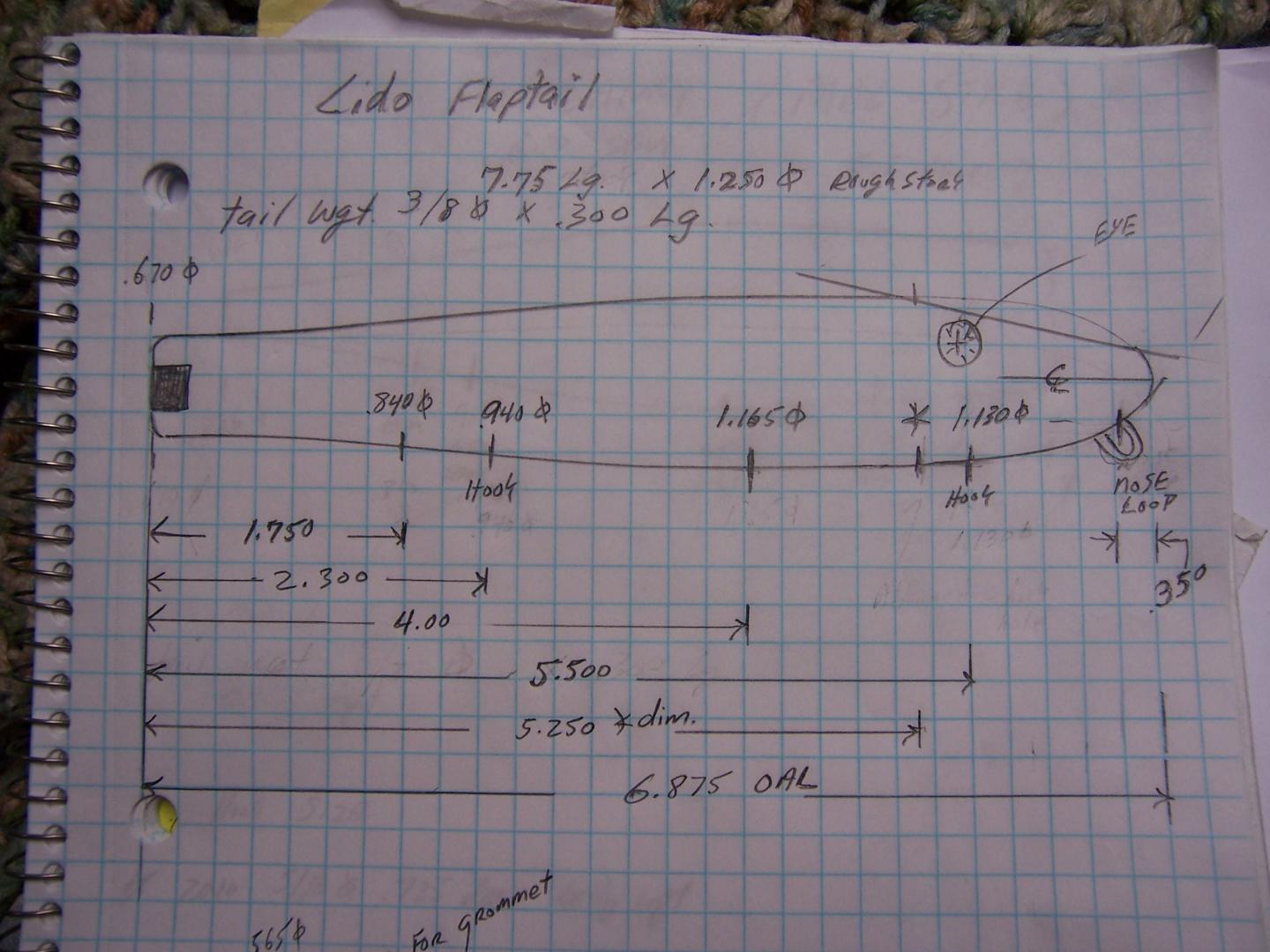 ProfessorM was kind enough to post his diagram for the Flaptail so I asked if it would be alright to reproduce it so that others would be able to print it out and turn out some baits during the off season. If you have a photoediting program you can resize it to make the diagram any size you like. Again Thanks to ProfessorM!!