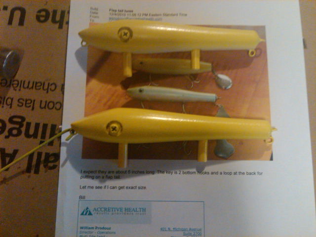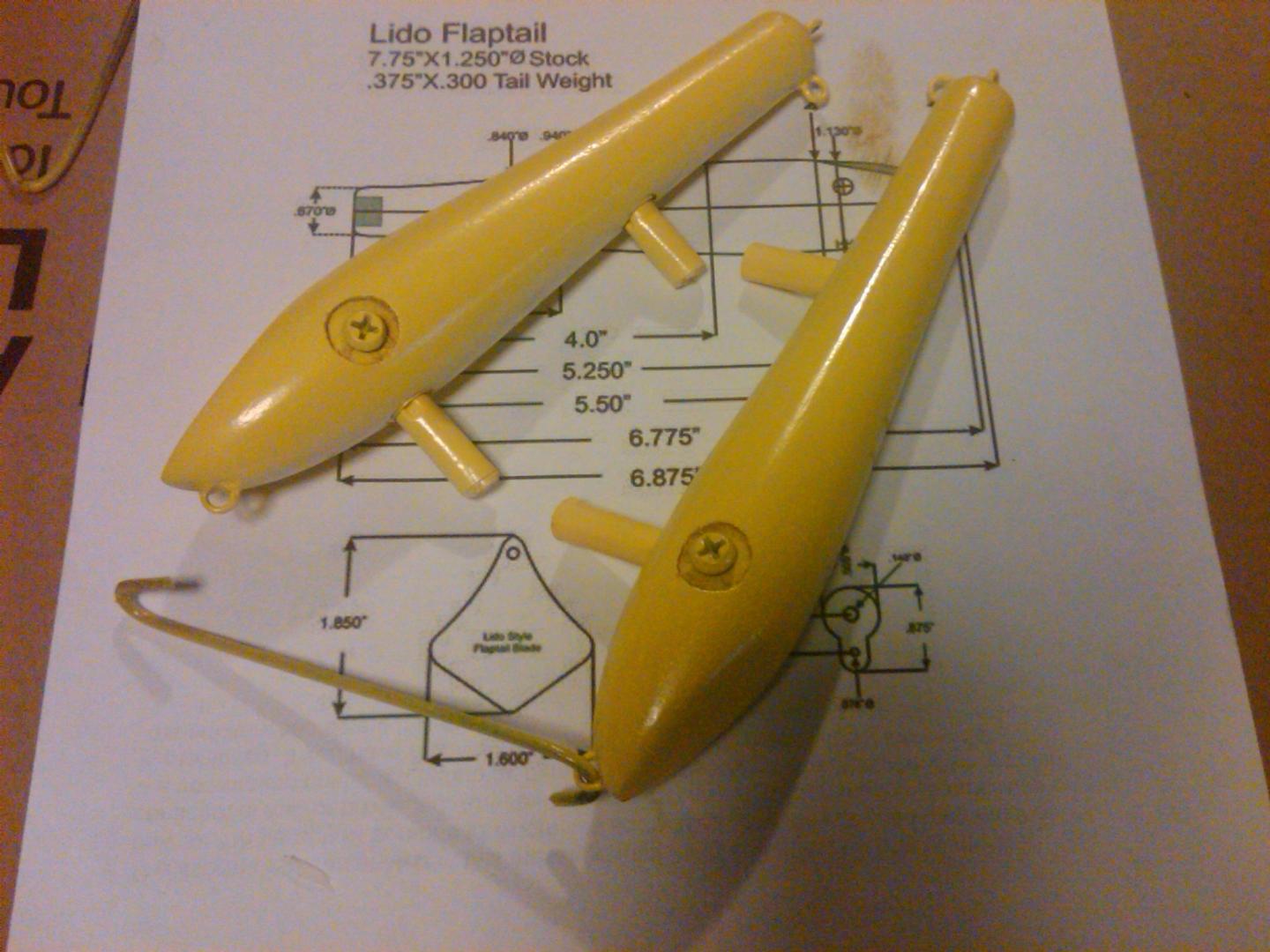 Here are a couple of photos of my dad Bill's attempt at Flaptails in process (He now has a S-B log on as Plugbillder so he can see pictures etc.). Thanks to Blackjack and Professor M for the background I used in the photos and the dimensions of lures. He still has screws in the eyeholes and straws covering the bottom swivels which he does when spray painting. Between the diagrams and pictures and discussion I picked up on this thread and me giving him directions over the phone or by email this is where he has progressed on these. We decided the easiest way for us to attach the flap is using an additional loop in rear below the body. Now we have to figure out how to attach the flap to the loop.