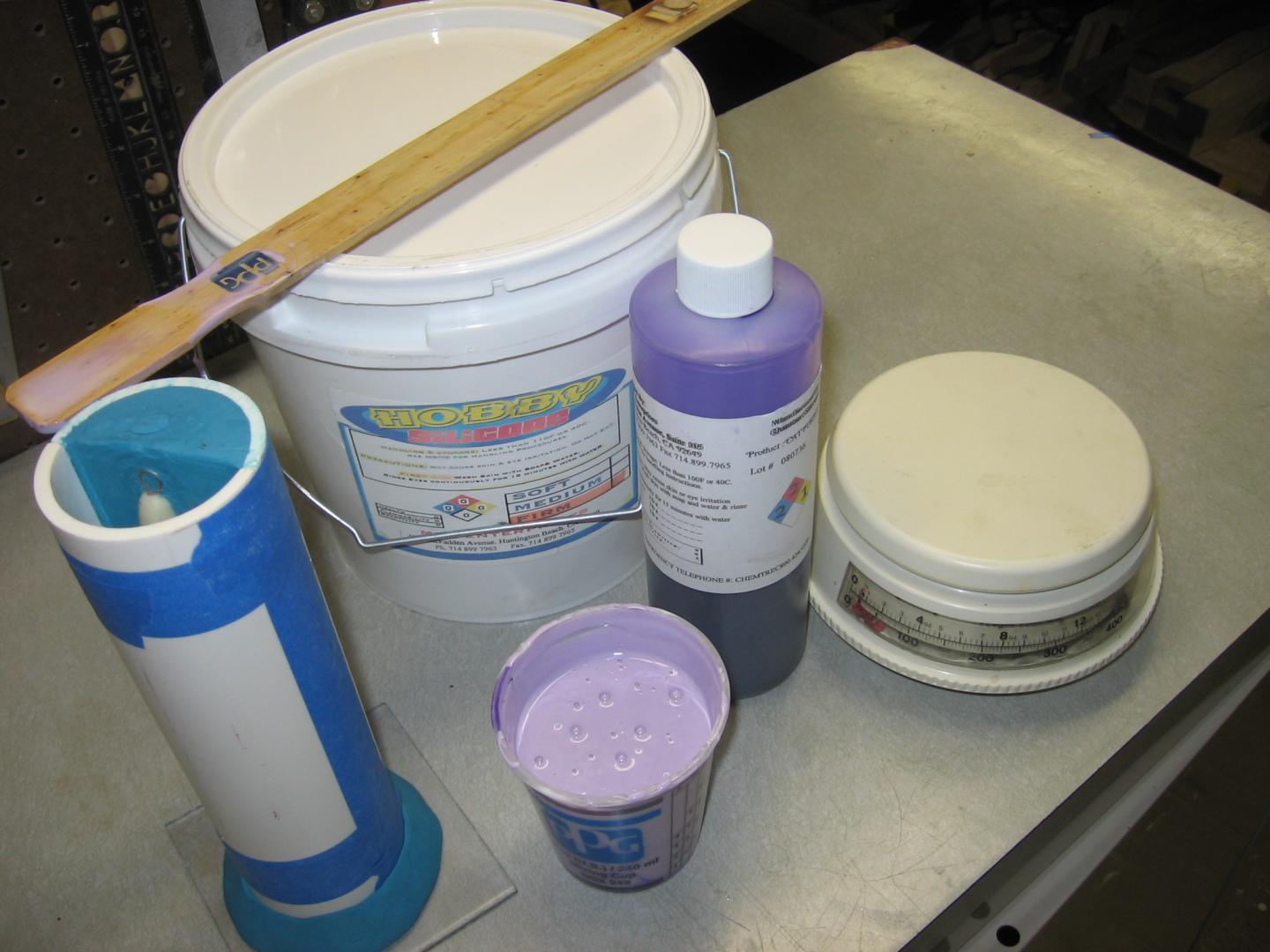 The mold box is PVC cut lengthwise. Fill one half with modeling clay and imbed the master half way, be sure to include some type of key ( I used marbles here).NOTE I've seen people use a dowel or something here for a pour passage here, I cut a passage later. Tape mold together, hot glue to base, mix RTV and pour the first half. Wait specified time, ( 14 hours for mine) then take mold apart and remove all the clay. Put the master in the RTV, coat the RTV with a release agent, tape the mold together, hot glue to base, mix and pour the other half of the RTV. See how wordy, and this is condensed. Heres some pics.