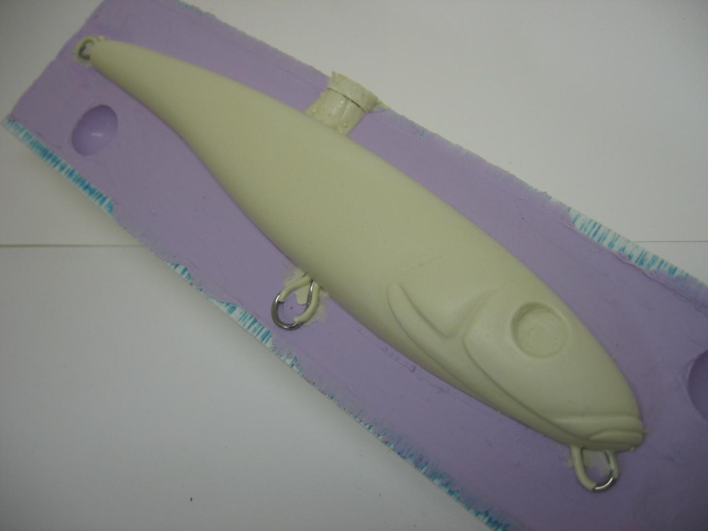 So far I've only done a few lure molds. One is this 7" minnow style , one is this 6 1/2" popper and one jerk/twitch that I've not posted yet. With left over RTV I have made a few eye molds using glass eyes, its nice to have something to pour with leftover resin. The pics show the popper master, a jig for both thru-wires, and the resin.