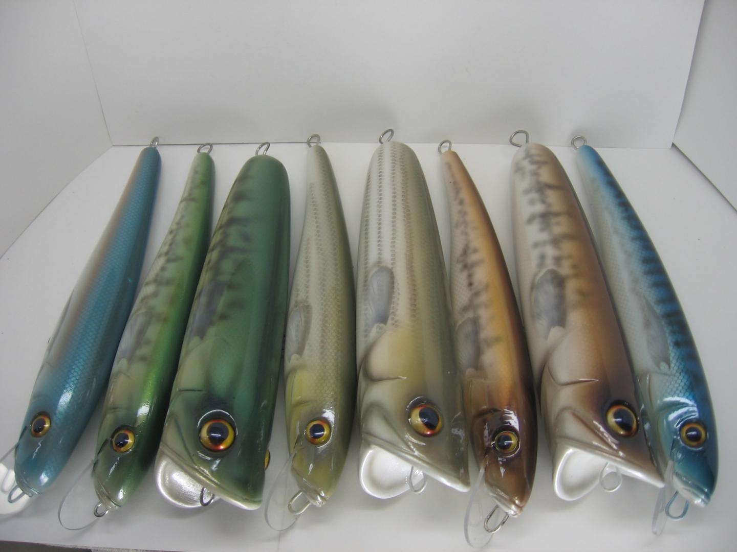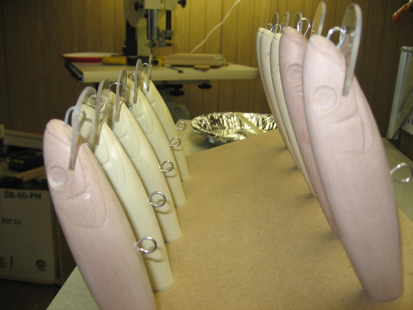 Making jigs as always, aids in the process. I made jigs for the thru-wire, the lip slot cutting, and a holder for the lures with the epoxied lips to stand. Yes, The lip slot could have been molded in, but I wanted to be able to use different lips and lip angles. One version of this minnow style lure I have has a deep diving bill with the line tie on the bill. For that one I'll make a shortened wire that only goes from the belly hook to the tail for the mold. The longer diving bill with the line tie is epoxied in later, and the lip slot is cut at a sharper angle. Heres a pic with some lips epoxied in place, one example of a deep diver and a few others.
