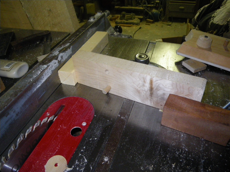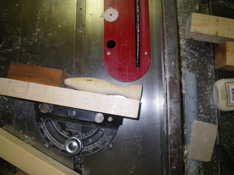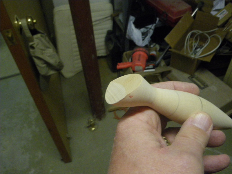 The head has two angles (roughly a 10 degree chin and a 50 degree forehead). I do that on the table saw using a small jig....just a board with a dowel in it to index the weight hole, and the same tail pin block I use on the sled. Use your mitre gauge at the correct angles for both cuts. You can use a stop block to position the setup.