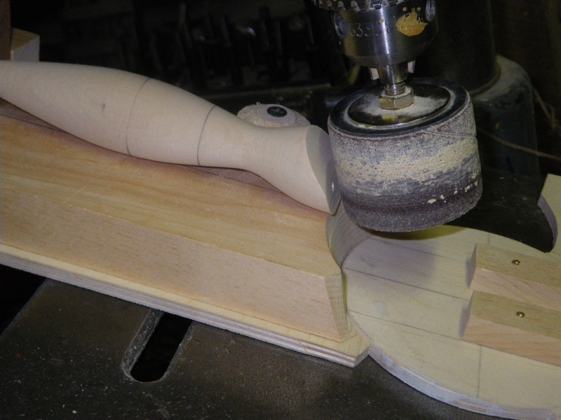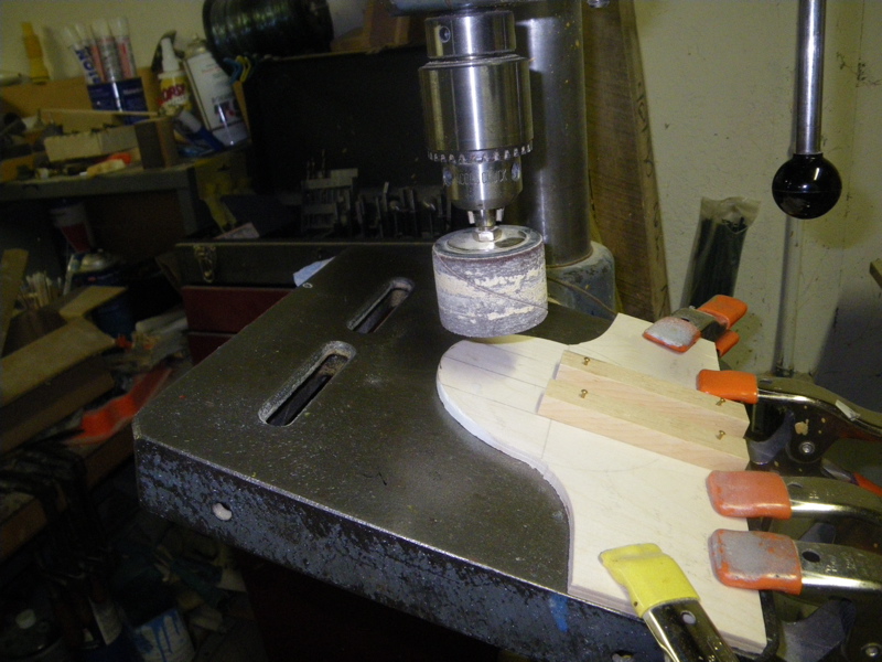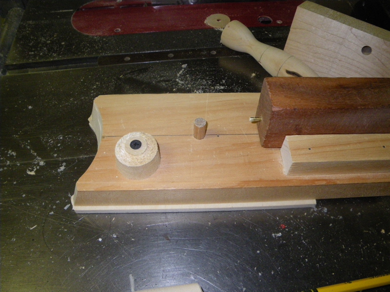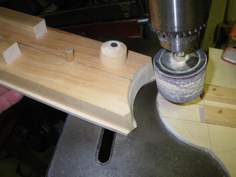 It needs a base you will clamp to the drill table (which has been tilted-I used 20 degrees) and a sled that indexes with the base to swing the plug past the sanding drum.