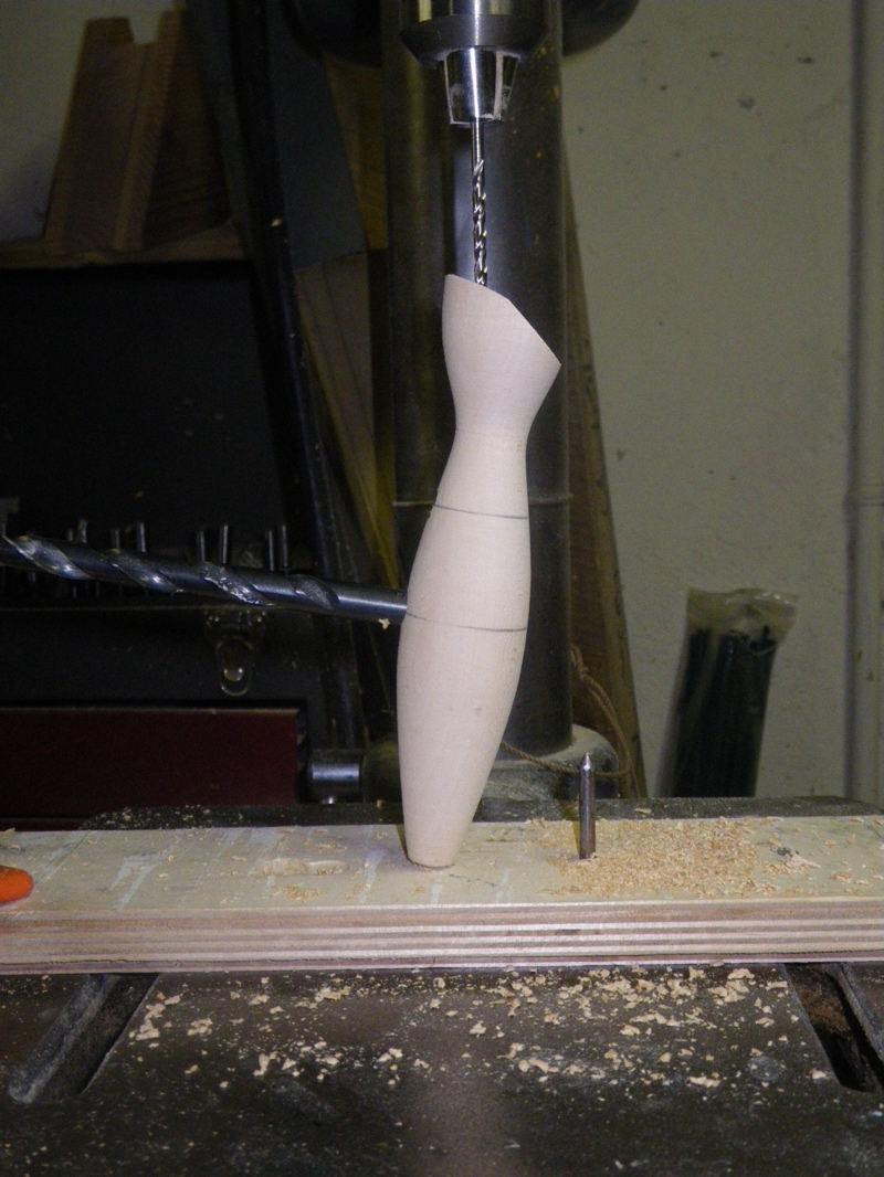 To get the angled hole to meet the center drilled hole in the hook hole I use a board with a nail to index the tail hole, offset the nail so the hole will travel at an angle to intersect the hook hole at the midline, and put a drill bit in the weight hole to help me keep everything aligned with the board. The tall nail in the picture isn't used for this plug.